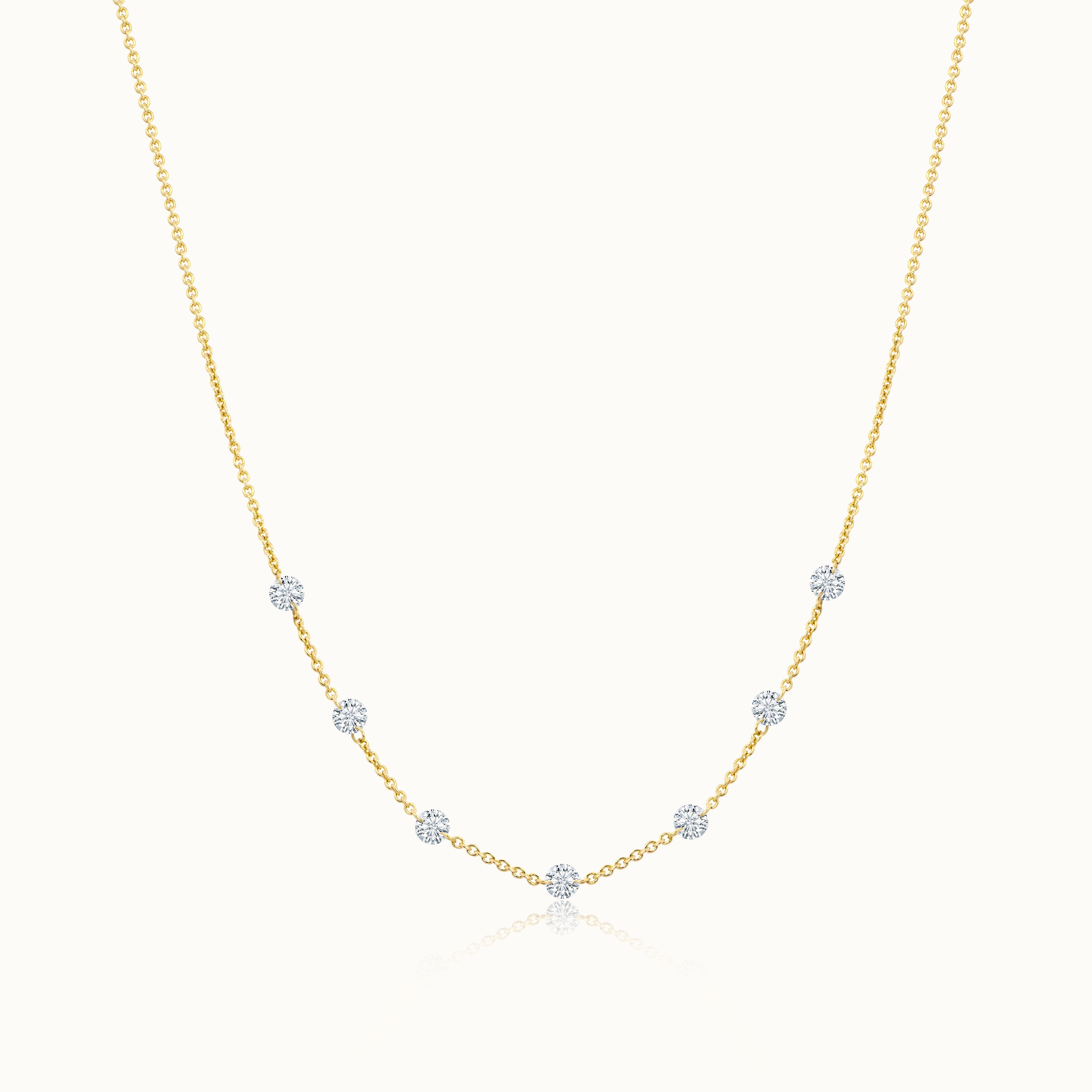 Illuminate your look with this elegant 18K gold diamond station necklace, featuring seven diamonds evenly spaced across the front for a refined, balanced sparkle. Each diamond adds a touch of brilliance, creating a timeless, minimalist design that’s perfect for everyday wear or layering with your favorite pieces.