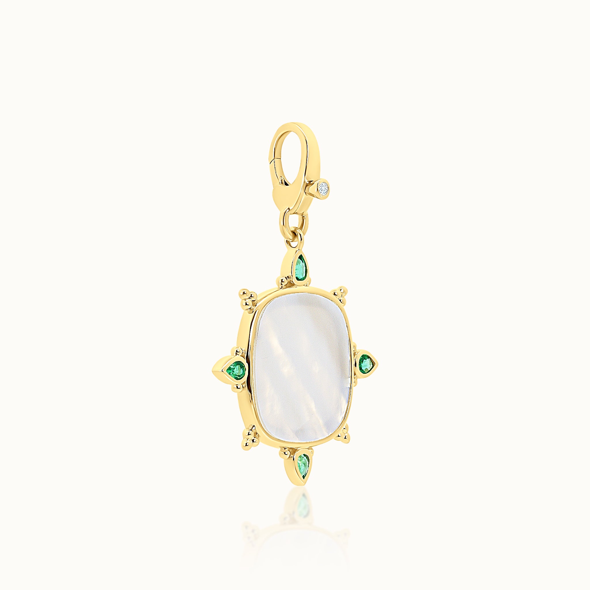 This yellow gold charm features a bezel-set mother of pearl in a rounded square shape, accented by pear-shaped emerald spikes on all four sides. A striking blend of softness and edge, crafted to captivate.