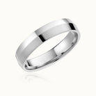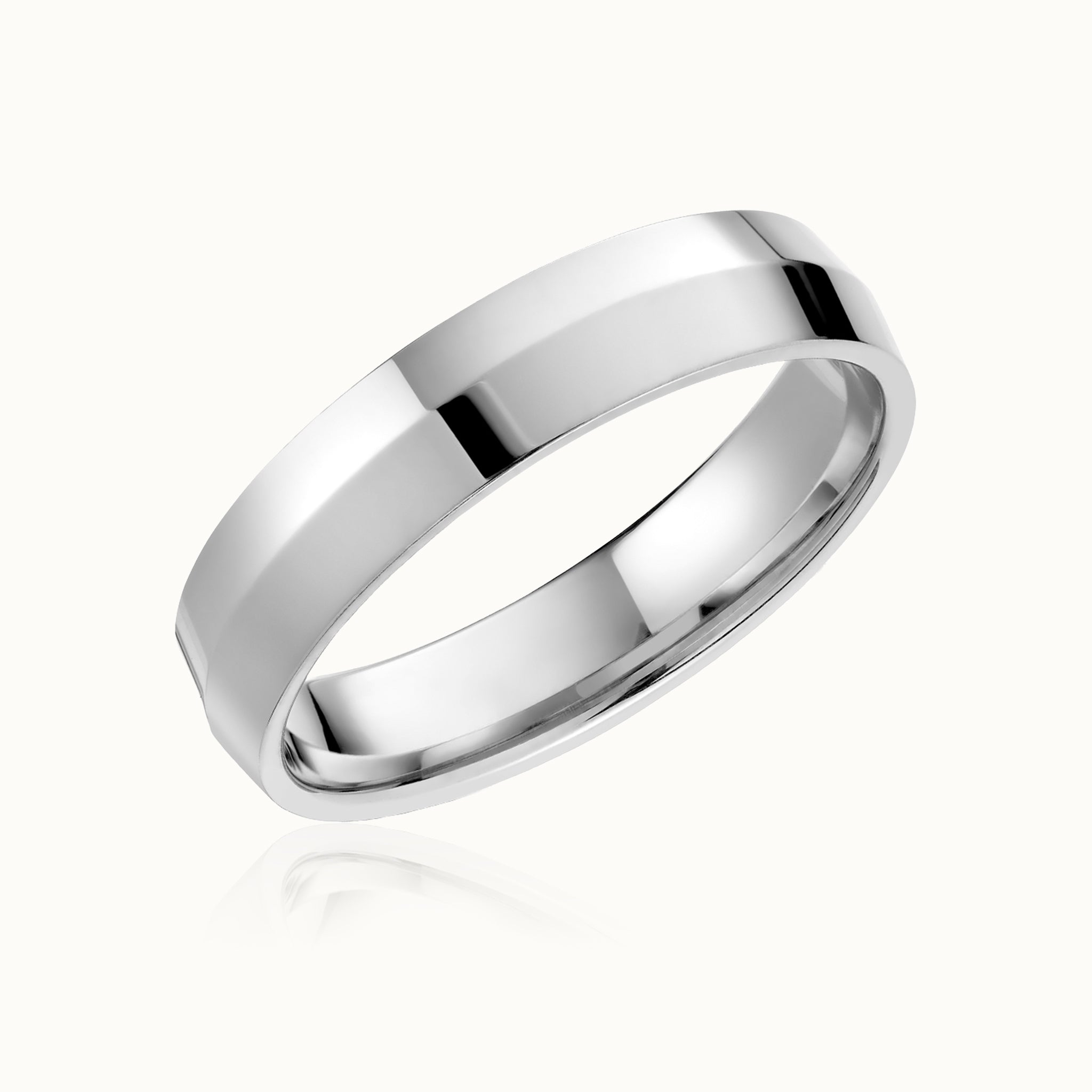 This men’s 14K white gold wedding band features a sharp knife-edge design for a bold, angular silhouette. Its sleek, polished finish offers a modern and distinctive look perfect for the confident groom.