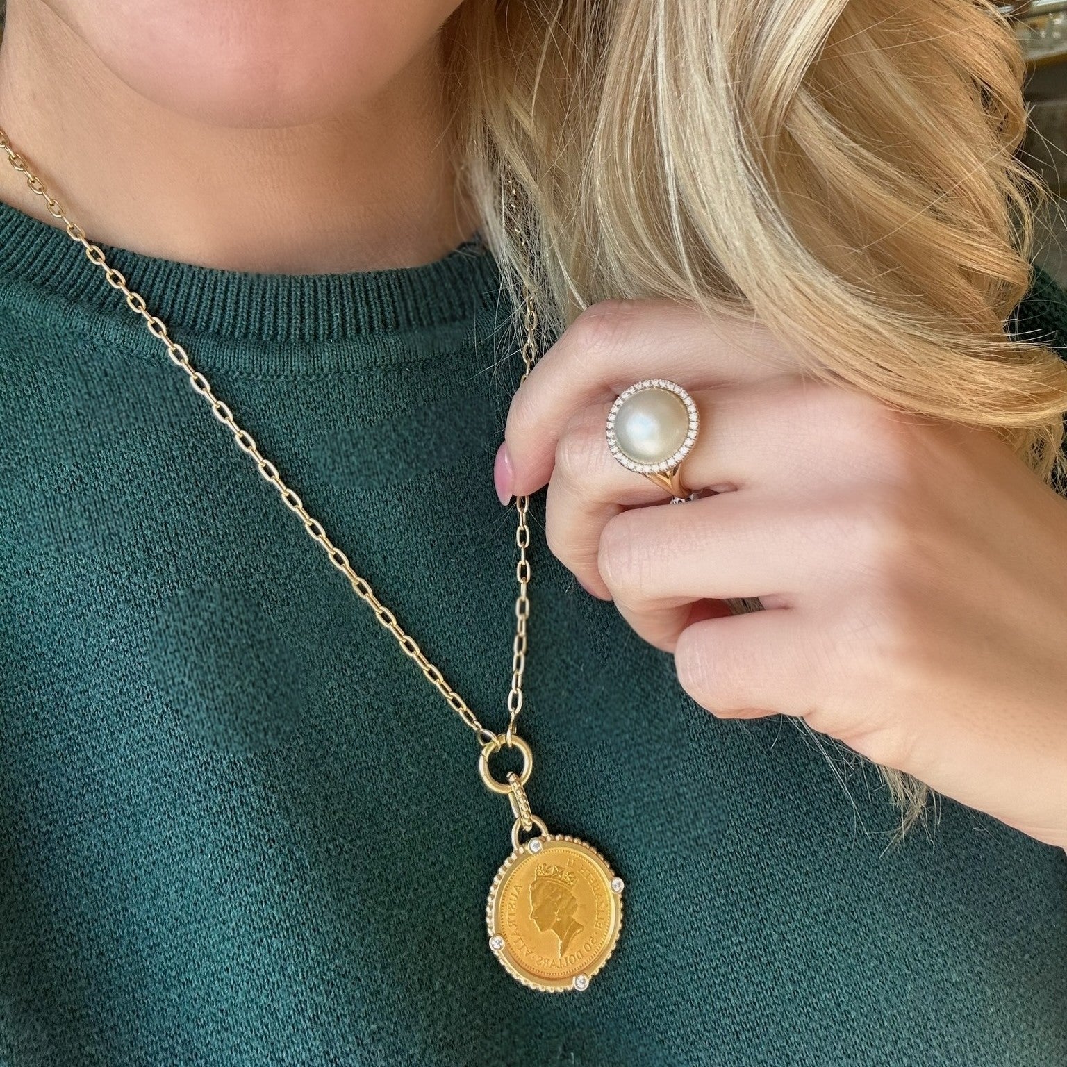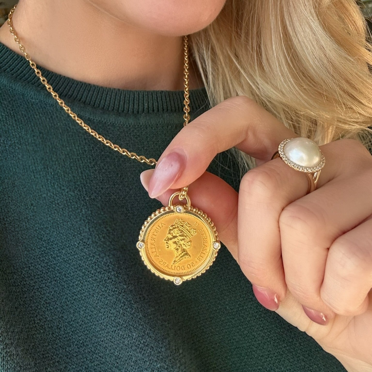 This pendant showcases a 1990 Australian Nugget coin, framed in a dazzling diamond bezel that elevates its golden heritage. A collector’s treasure reimagined as fine jewelry.