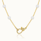 Timeless elegance meets sparkling romance, this yellow gold necklace weaves lustrous pearls along a delicate chain, brought together by a diamond-encrusted clasp. A piece made to capture hearts and elevate every moment.