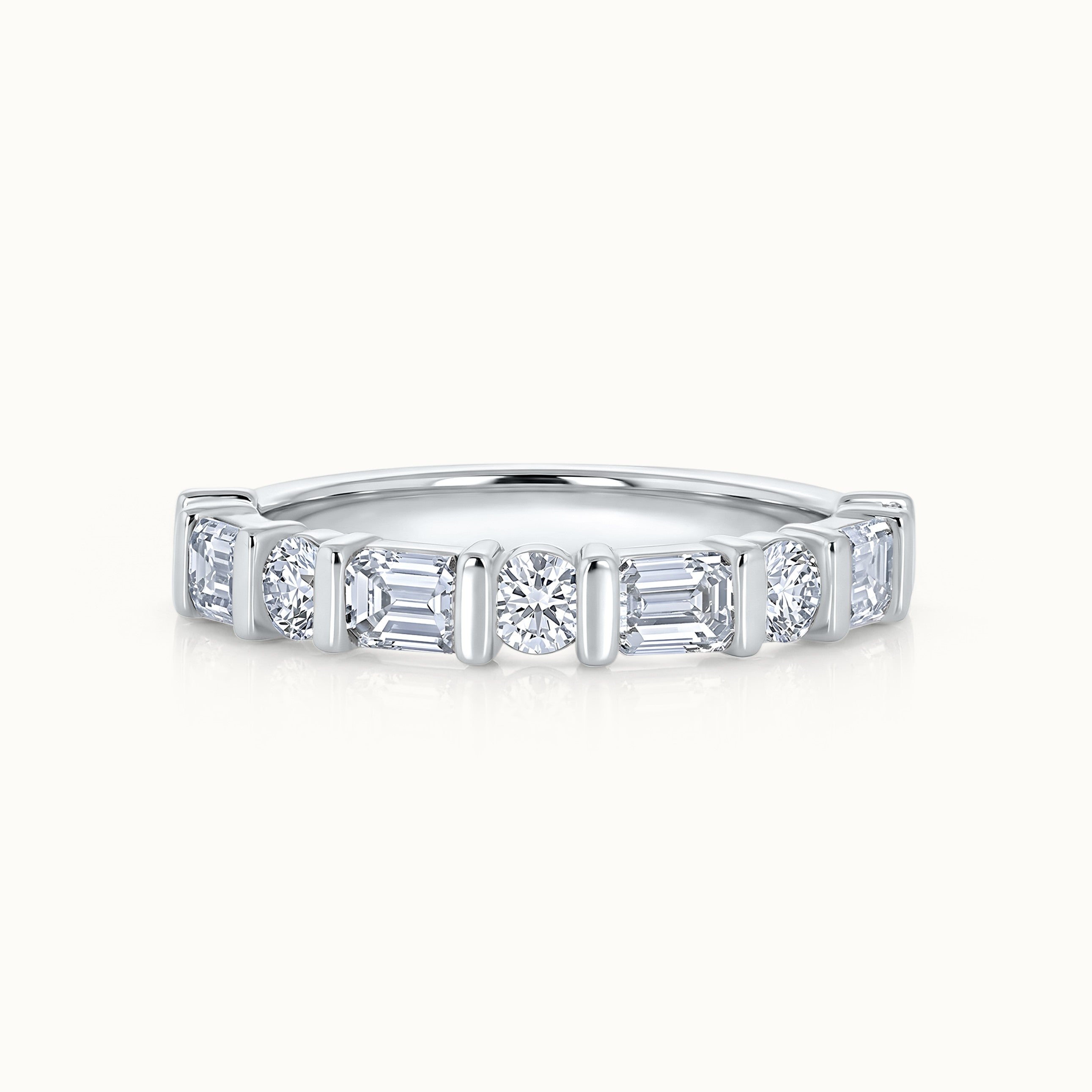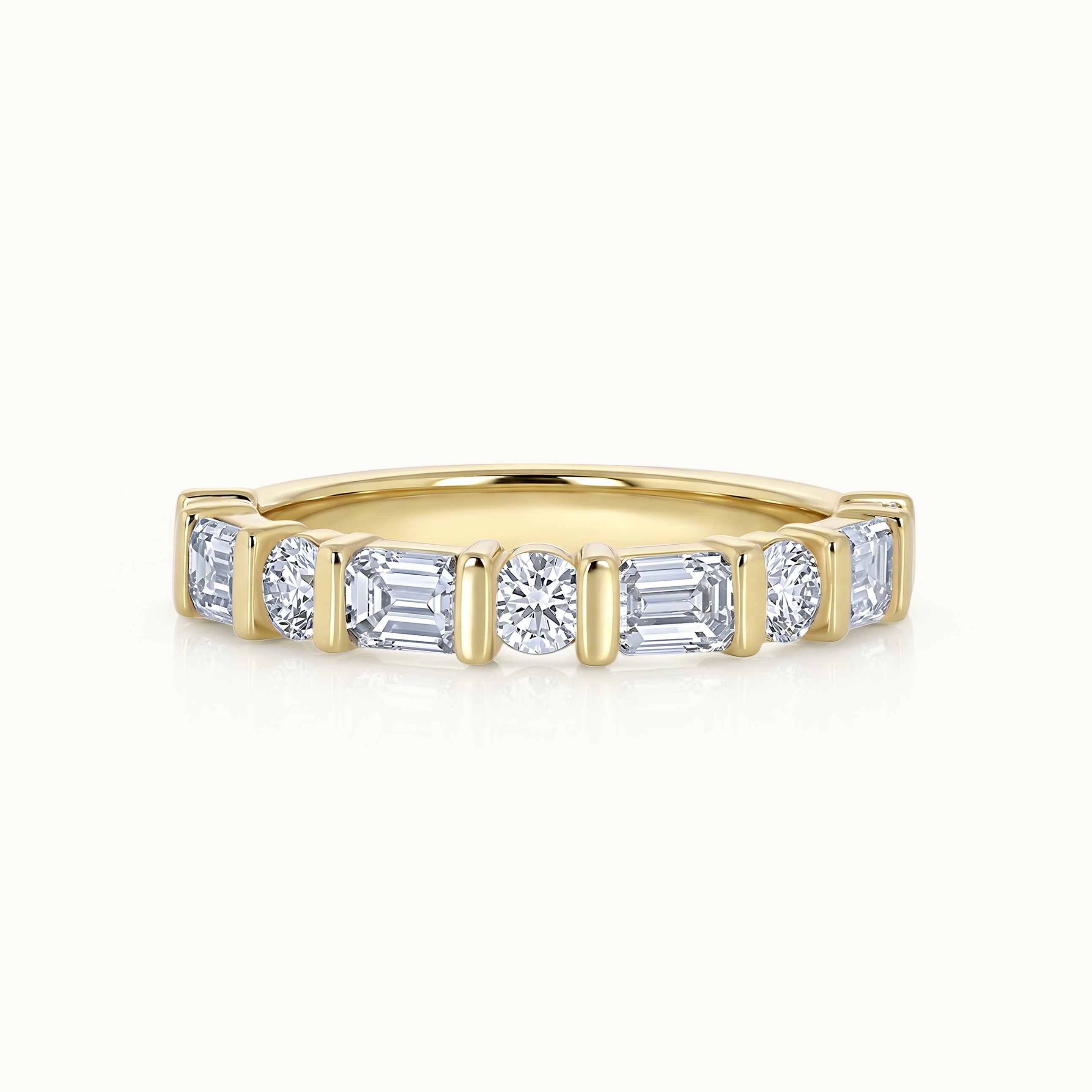 A refined balance of classic brilliance and modern design, this 14K gold diamond band features an elegant alternating pattern of round and emerald-cut diamonds. The contrast between the soft sparkle of round stones and the clean, linear facets of emerald cuts creates a dynamic, eye-catching rhythm across the band.