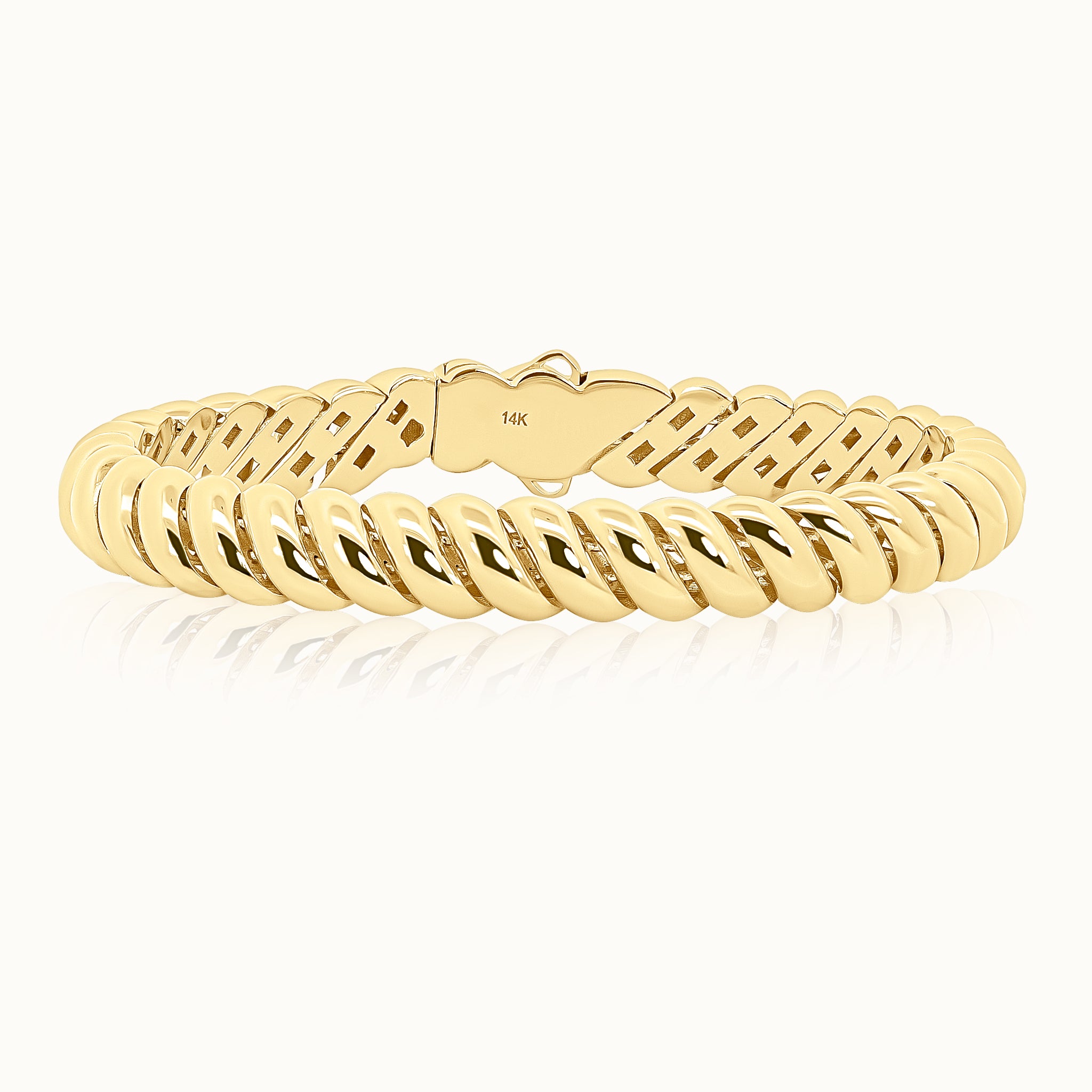 Bold and timeless, this 14K yellow gold ribbed bangle features sculpted grooves and a rich polished finish for striking texture and dimension. Designed to stand out on its own or layered with other favorites, it offers classic elegance with a modern edge.