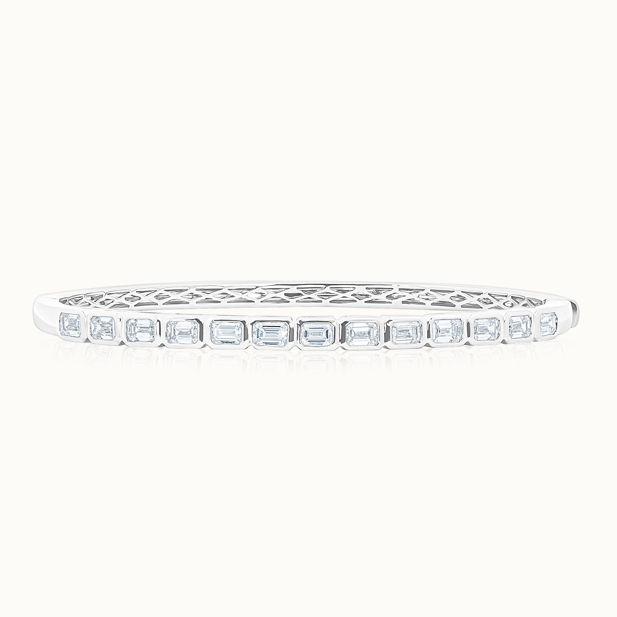 Sleek and sophisticated, this 18K white gold bangle features emerald-cut diamonds set in a clean, modern design that highlights their crisp lines and brilliant clarity. Elegant and timeless, it’s a refined statement piece perfect for stacking or wearing on its own.