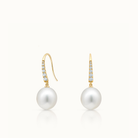 Elegant and modern — these earrings showcase lustrous pearls suspended from delicate, diamond-accented hooks. A combination of subtle sparkle and graceful movement.