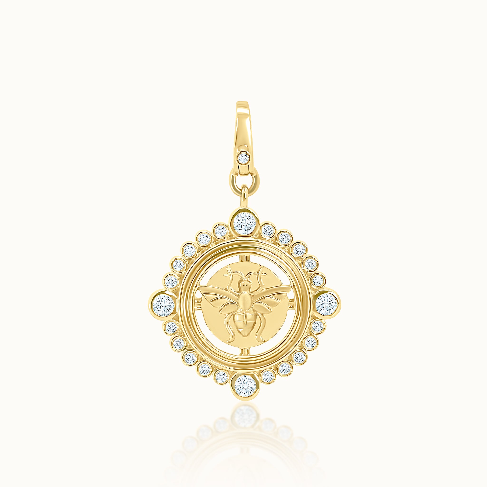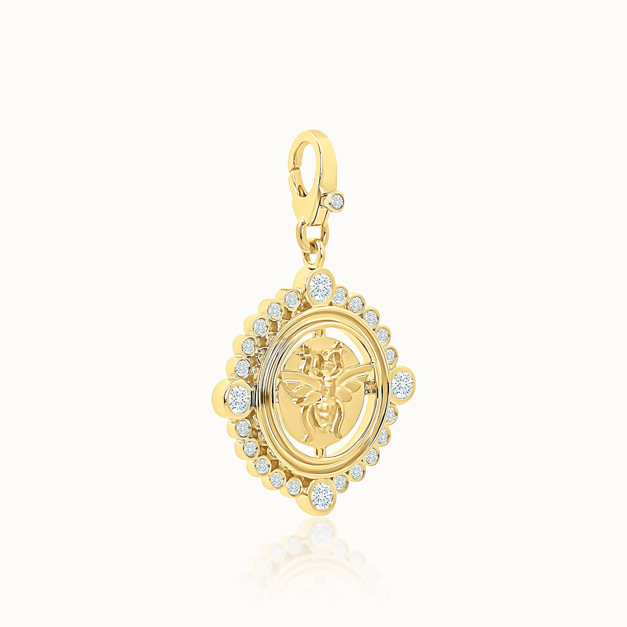Buzzing with brilliance. This yellow gold bee charm is encircled by a halo of diamonds in varying sizes, adding dynamic sparkle to its whimsical form.