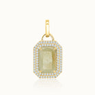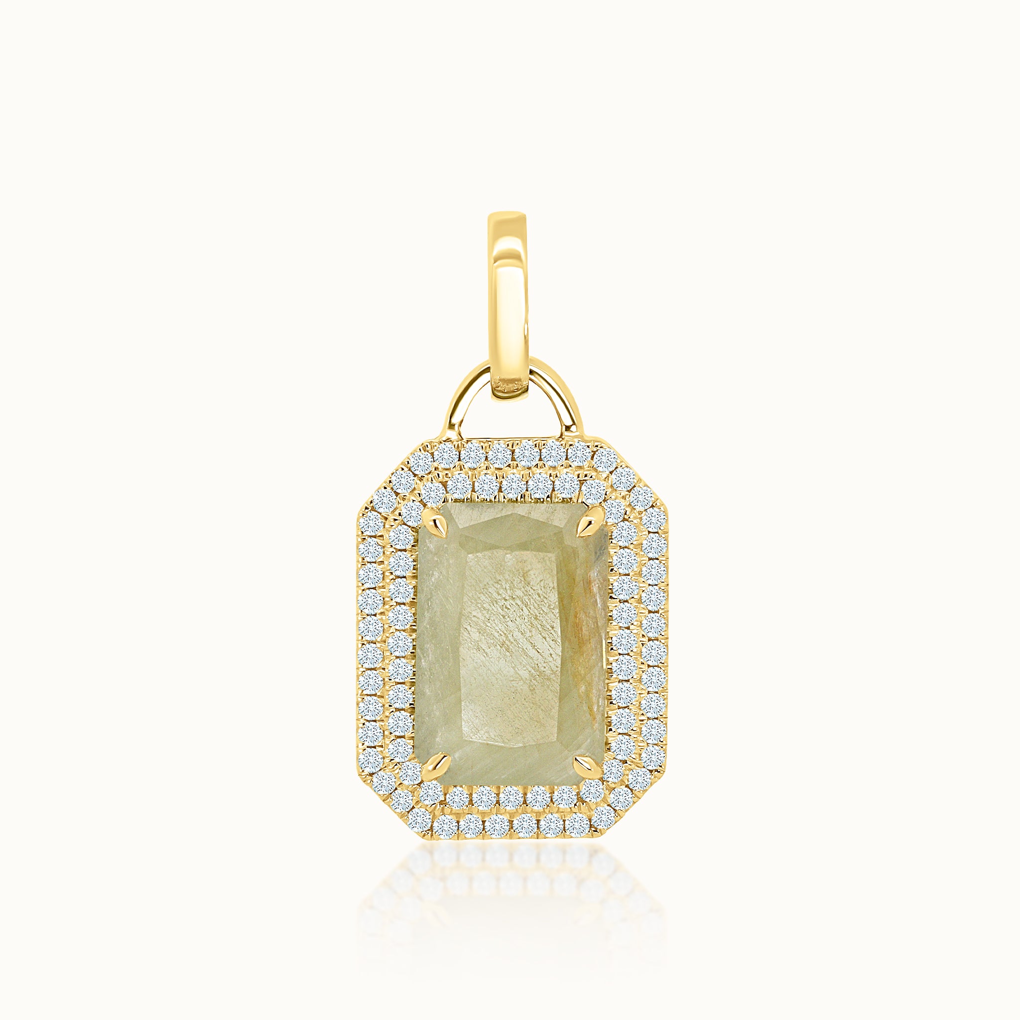 Ethereal and eye-catching. This sliced radiant-cut sapphire glows in a soft light green hue, framed by a double halo of diamonds.