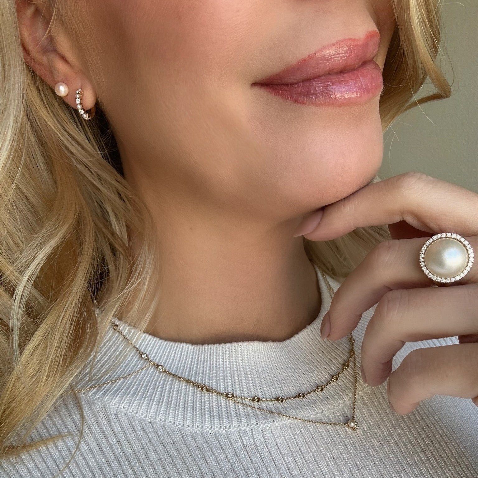 Timeless and refined — these huggie earrings pair lustrous pearls with sparkling diamonds for a look that’s both classic and elegant. Perfect for everyday wear or special occasions.