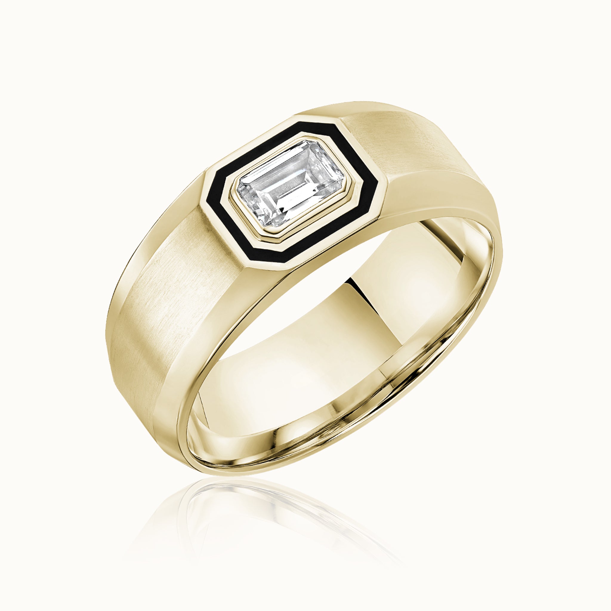 A bold take on a timeless design, this gold band features a bezel-set emerald-cut diamond framed by sleek black enamel. Modern contrast meets classic craftsmanship in a ring that’s understated yet unforgettable.