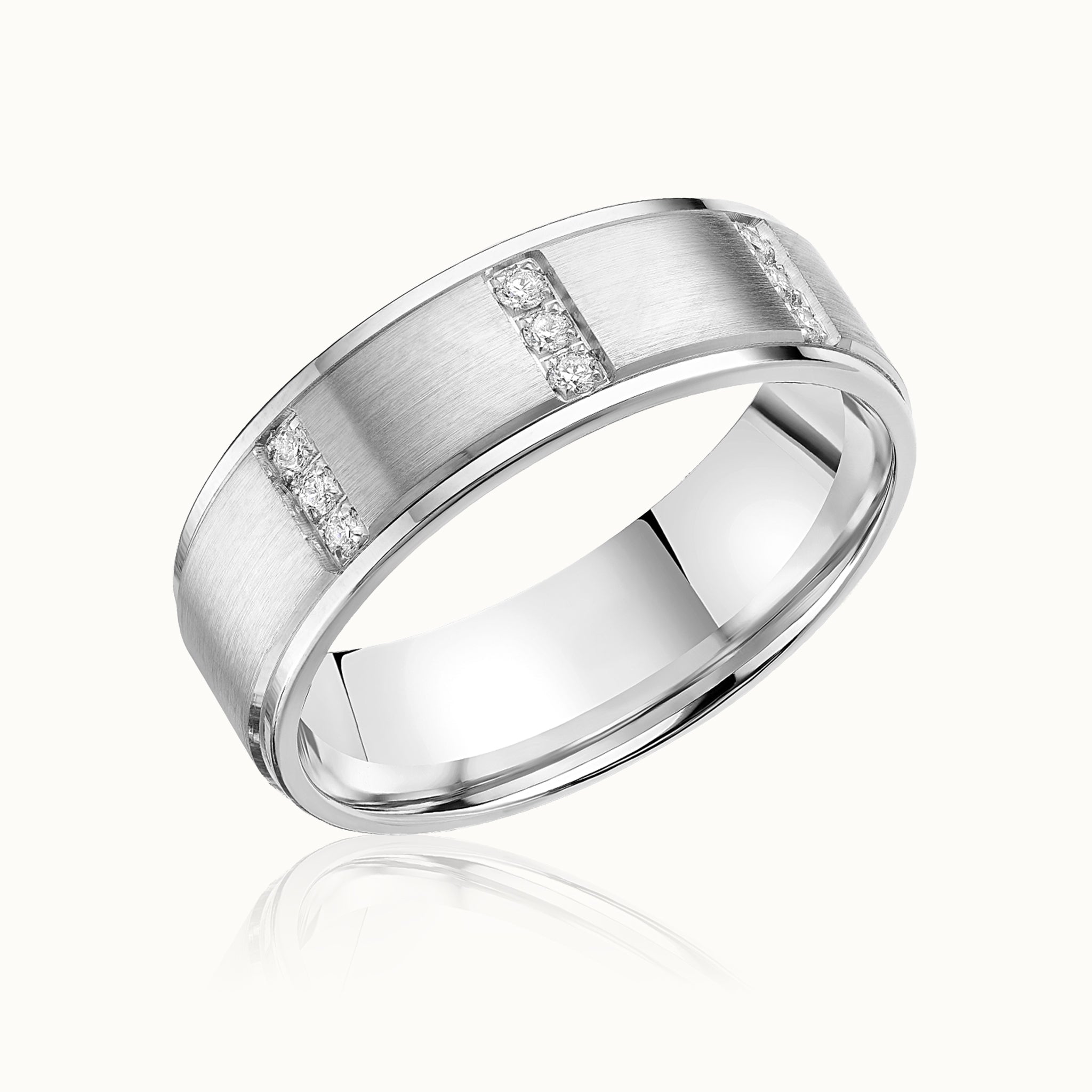 This men’s 14k white gold wedding band with a textured sandpaper center has high-polish edges for a striking contrast. Nine round diamonds, arranged in three elegant rows across the top, catch the light with subtle brilliance, giving the ring a refined, modern edge. Crafted for lasting wear, this band combines strength and style for the man who values both.