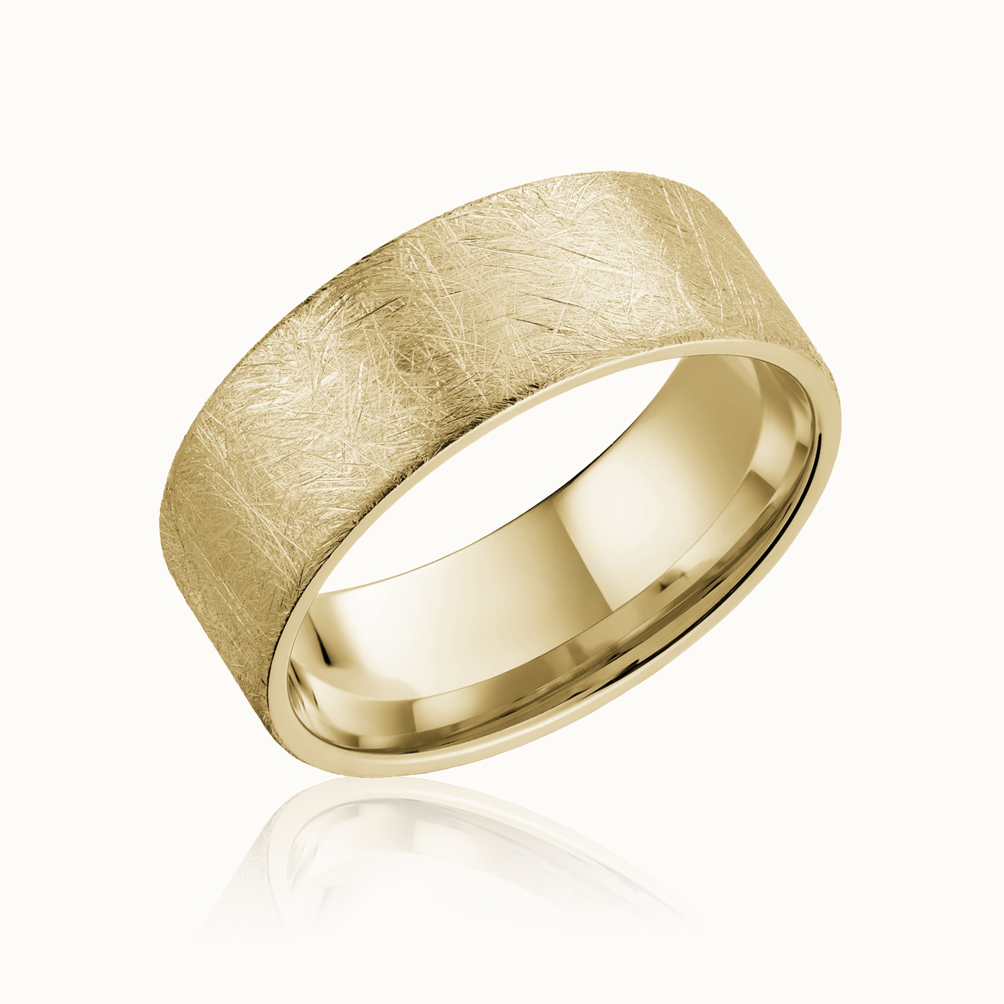 This men’s 14K yellow gold wedding band features a sophisticated diamond brush finish, offering a subtle textured look with a refined matte shine, perfect for the modern groom seeking understated elegance.