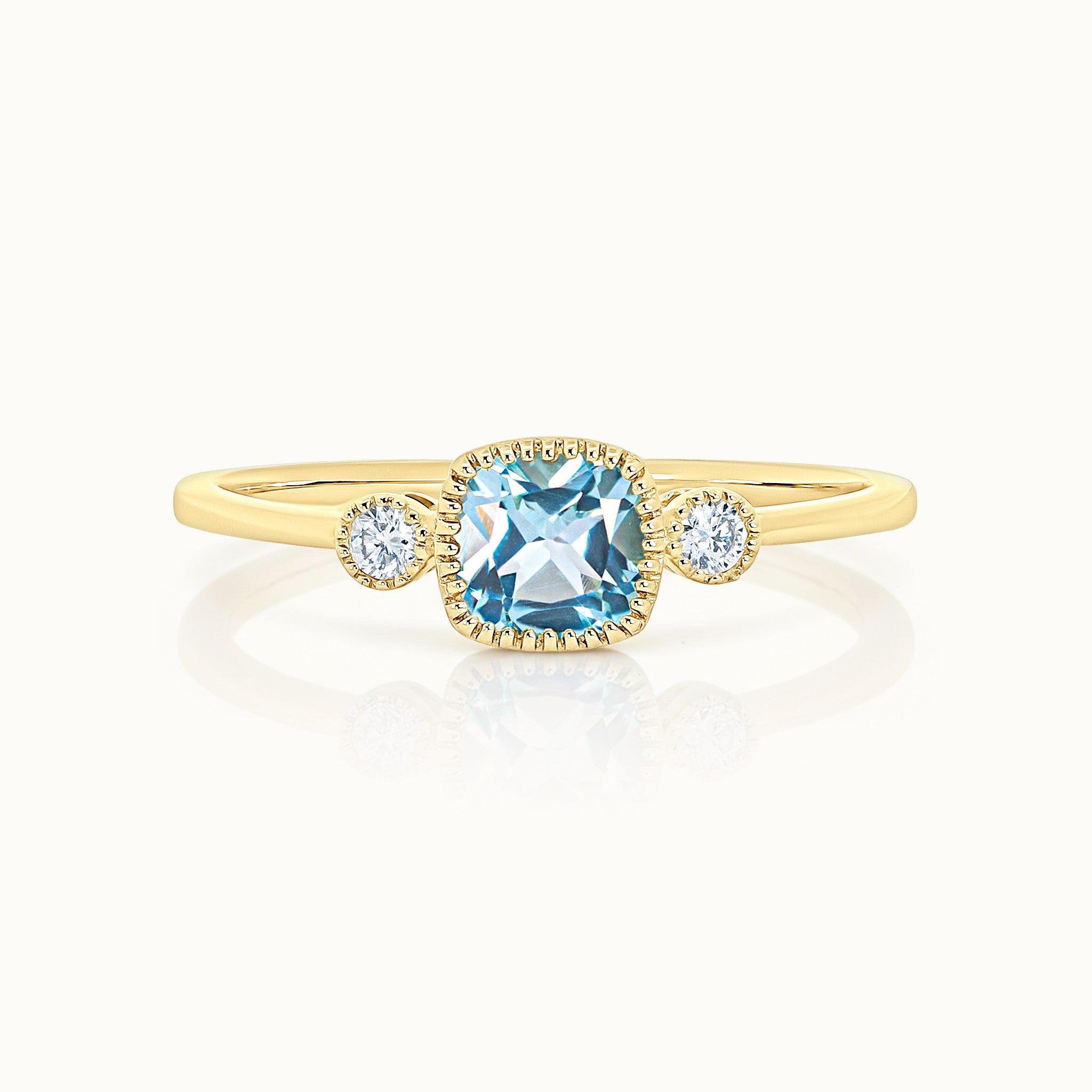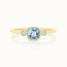 Charming and playful, this ring features a cushion-cut blue topaz flanked by round diamonds, all set in delicate milgrain bezels on a slim gold band. Its sparkling mix of shapes and subtle details gives it a whimsical, joyful elegance.