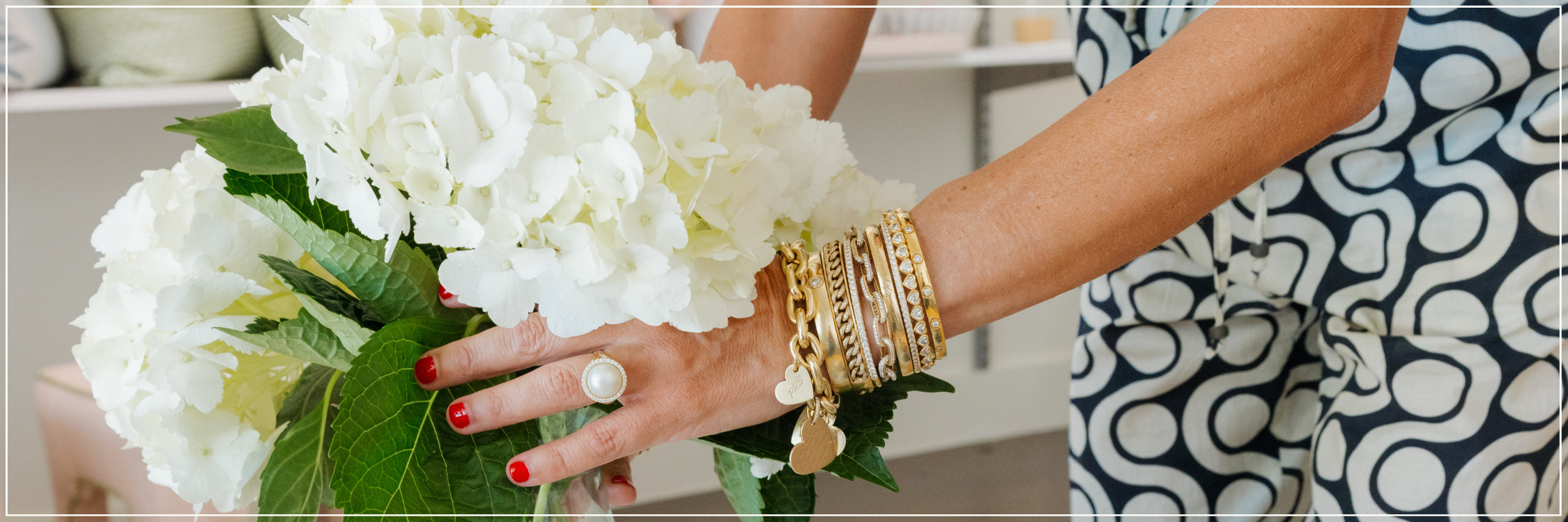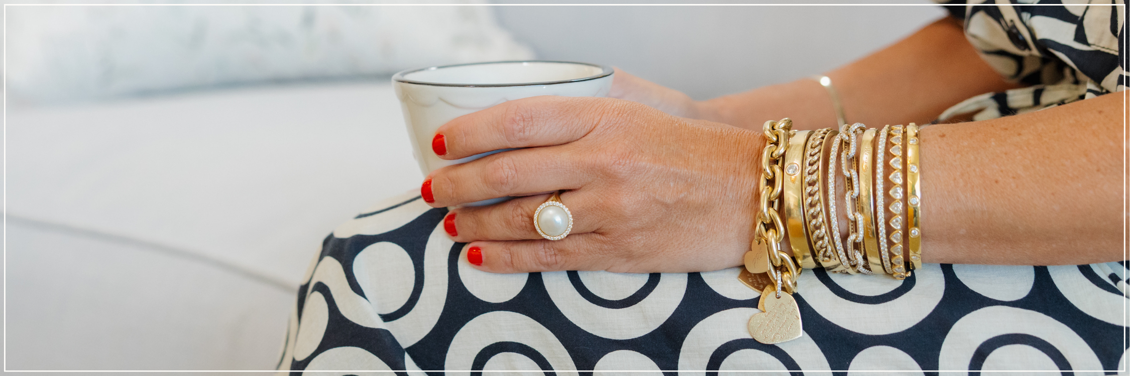 Emily’s signature stack blends statement style with sentiment. From solid gold bangles to personalized engravings, every piece reflects her story.