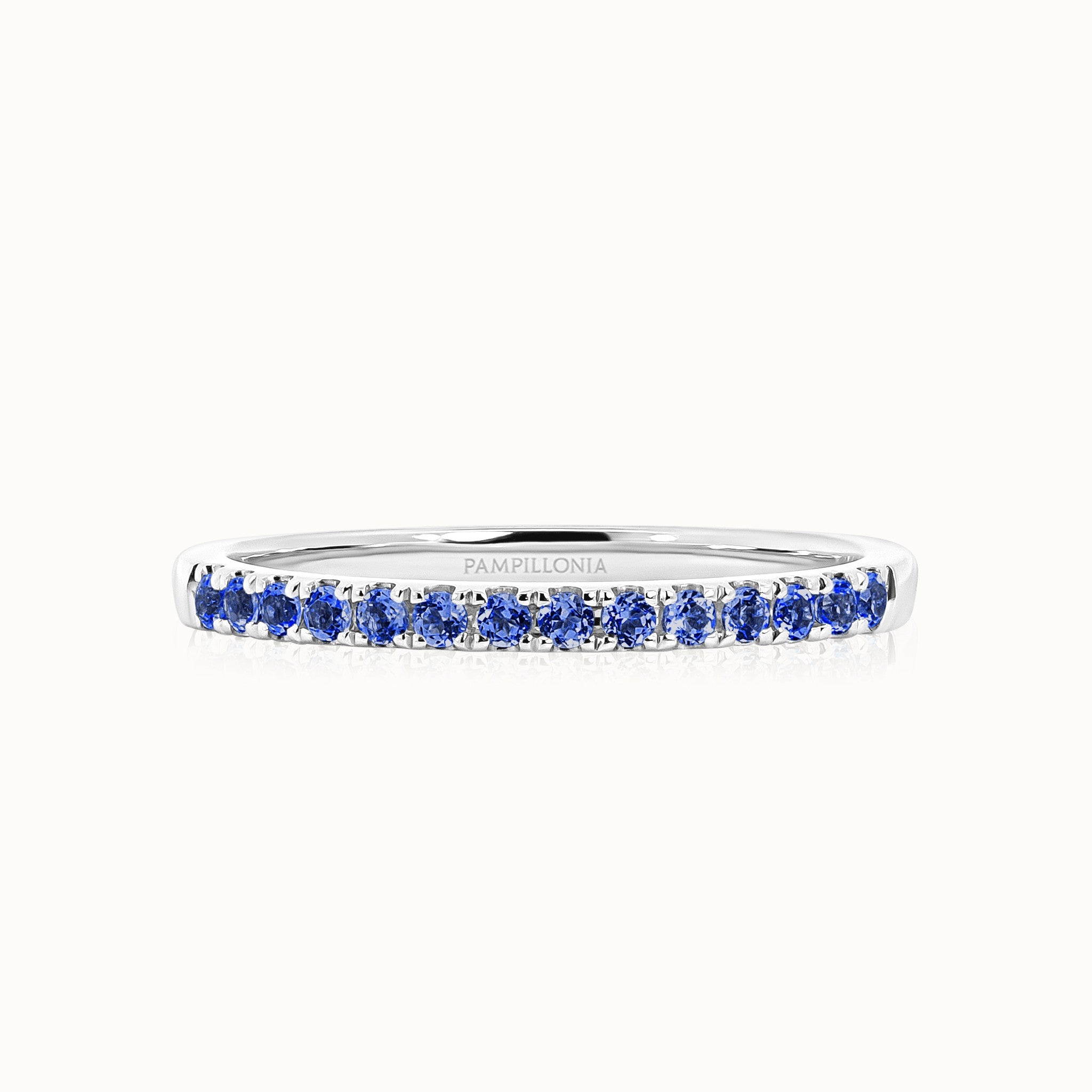 This ring features french set blue sapphires in elegantly sculpted prongs throughout the top of this band. Its clean lines and refined sophistication make it an everyday essential.