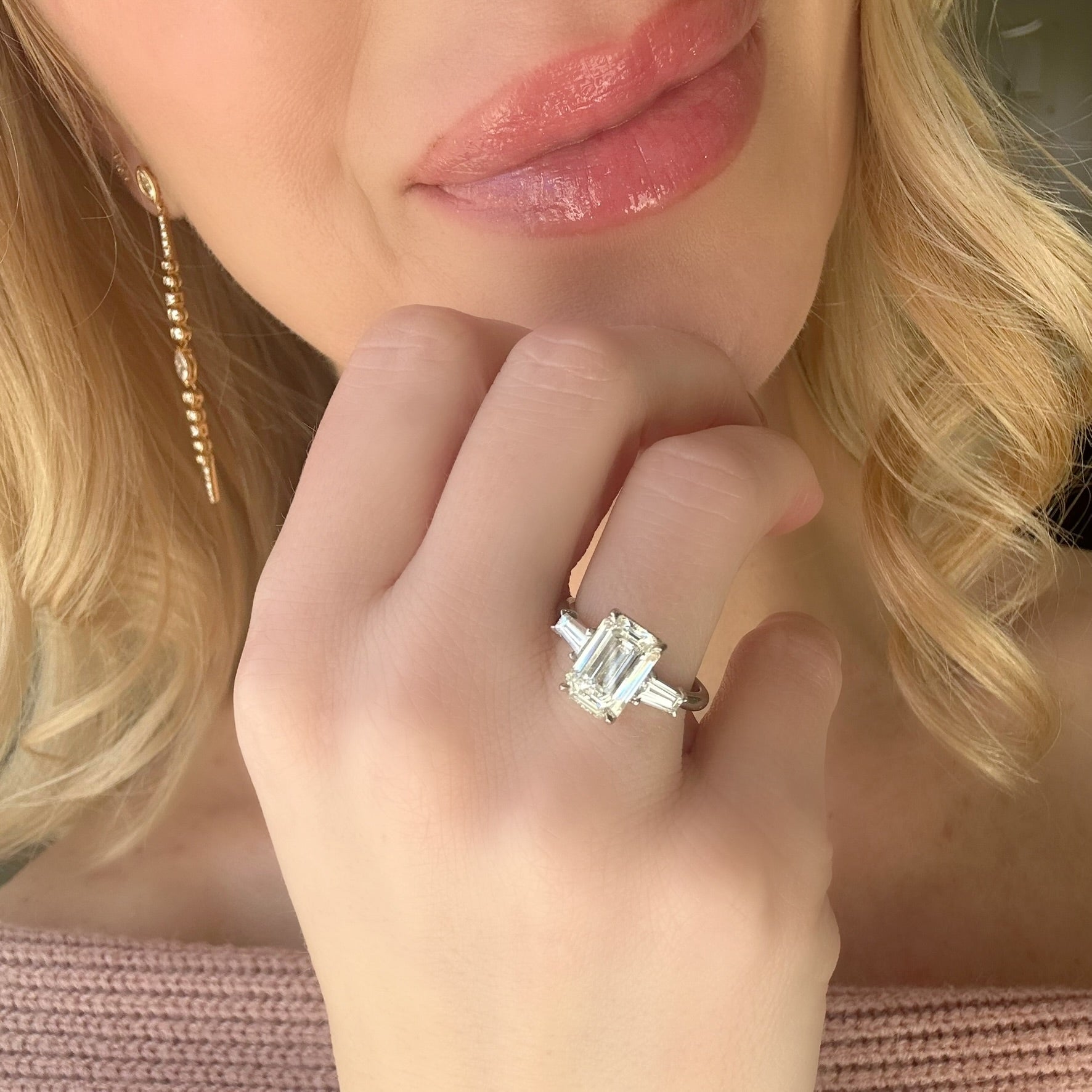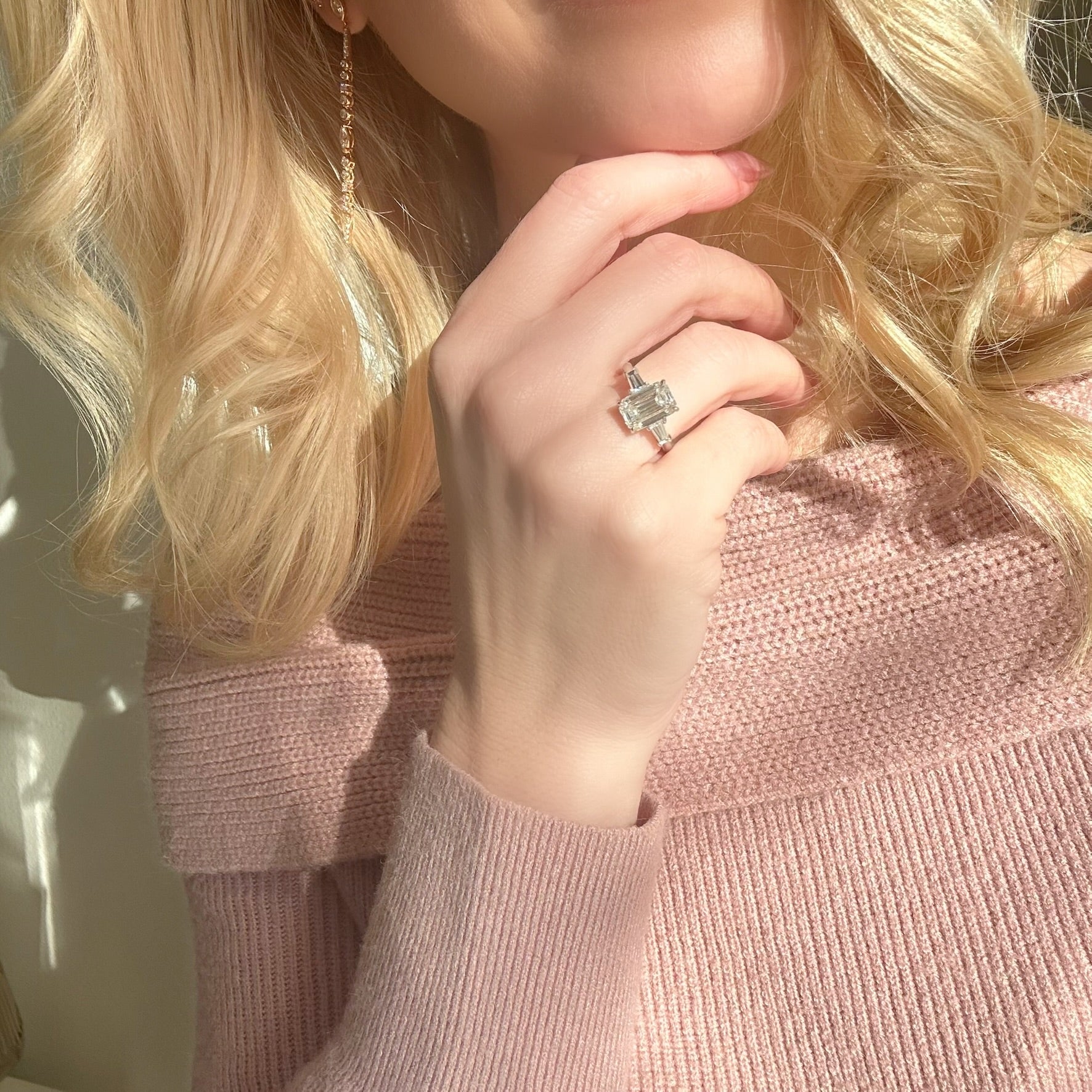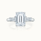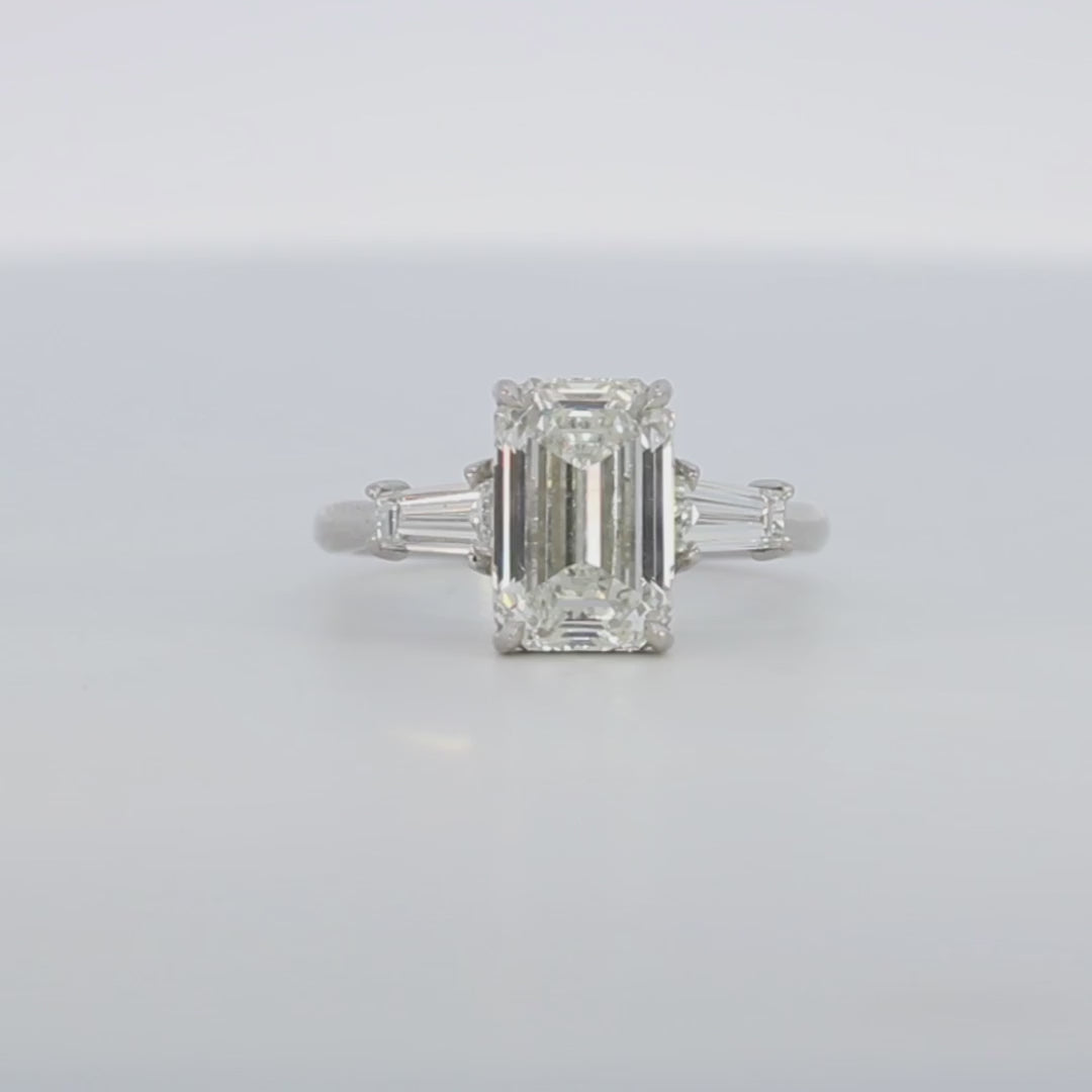This platinum three-stone ring showcases an emerald-cut diamond at its center, flanked by tapered baguettes that draw the eye to its clean, architectural lines.