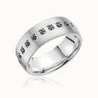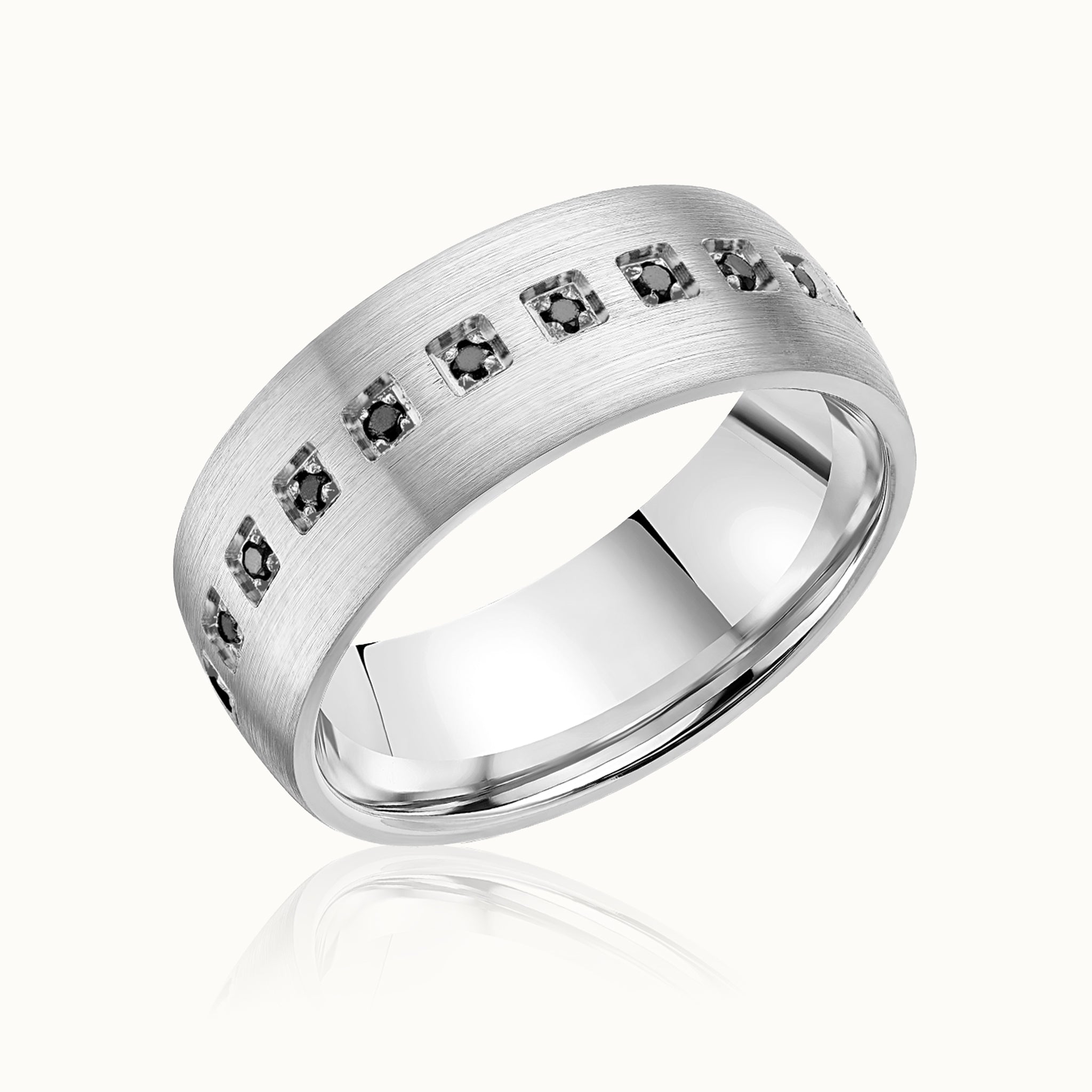 This men’s 14K white gold wedding band features a modern sandpaper-finish center accented with 21 black diamonds, each prong-set in individual recessed squares. The contrast of textured metal and bold black stones creates a distinctive, contemporary look for the groom who wants something truly unique.