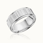 This men’s 14K white gold wedding band features a high-polish finish with unique vertical, organic ridge detailing in the center, framed by smooth edges. A contemporary design that blends modern elegance with subtle texture for the stylish groom.