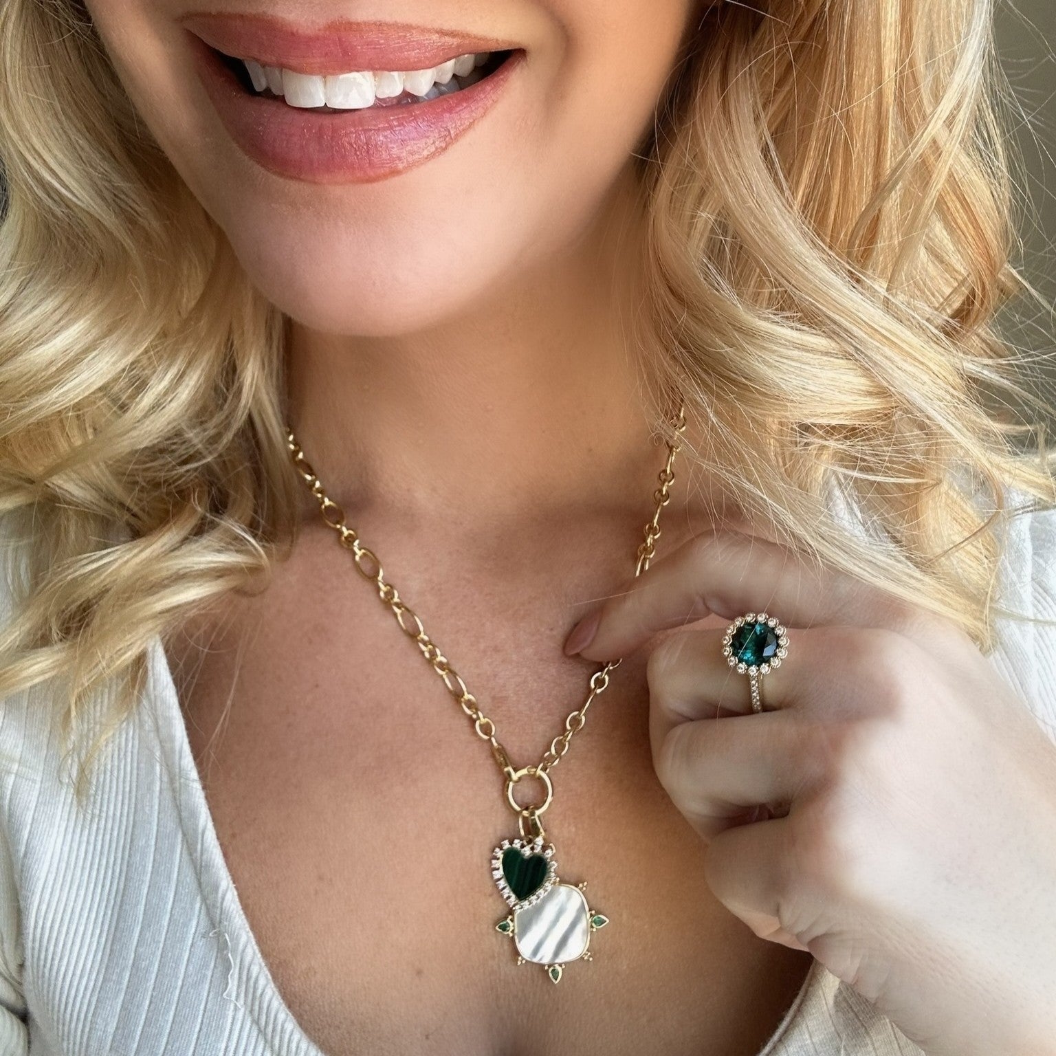 Earthy elegance with a bold edge. This heart-shaped malachite stone is bezel set in yellow gold and framed by radiant diamond spikes.